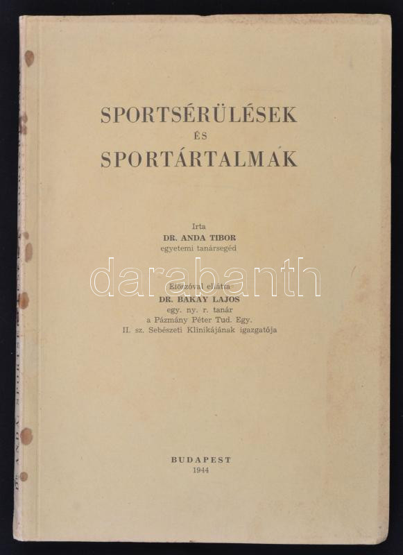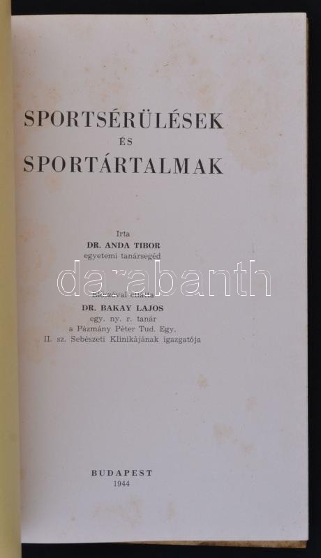 Dr. Anda Tibor: Sportsérülések és sportáralmak. Előszót írta Dr. Bakay Lajos. A szerző rajzaival. Bp., 1944, Turul Sajtóvállalat-ny.,170 p. Kiadói papírkötés, kissé foltos gerinccel. Jó állapotban.