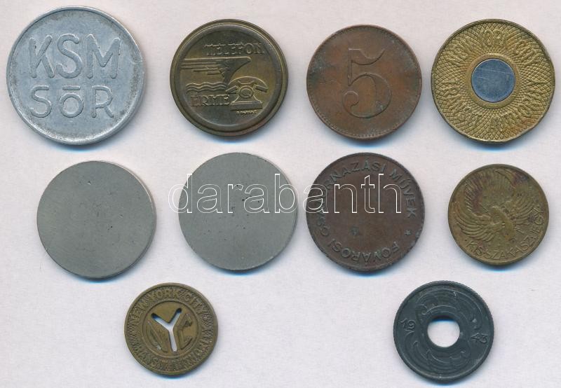 Leírás: Vegyes: 10db-os zseton és bárca tétel, benne "BKV", "KSM SÖR", "Fővárosi Csatornázási Művek", 1933. "BSZK RT / Kisszakaszjegy" T:vegyes