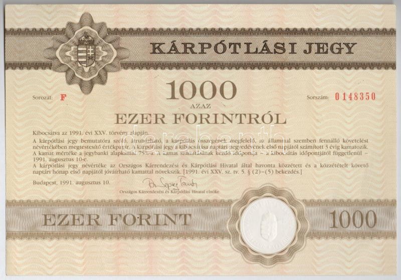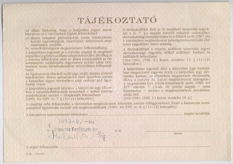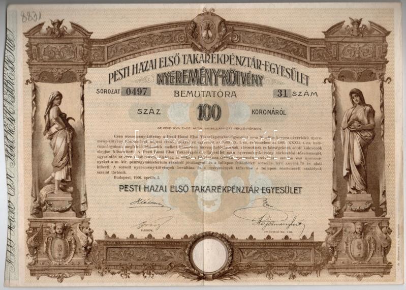 Budapest 1906. "Pesti Hazai Első Takarékpénztár-Egyesület" nyeremény-kötvénye 100K-ról, szárazpecséttel, nyereményszelvénnyel + Budapest 1923. "Budapest Székesfővárosi Közlekedési R.-T." kötvénye szárazpecséttel + Budapest 1991. "Országos Kárrendezési és Kárpótlási Hivatal" kárpótlási jegye 1000Ft-ról, "F" sorozat, szárazpecséttel T:II-III ragasztás