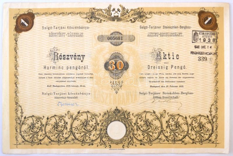 Leírás: Budapest 1935. "Salgó-Tarjáni Kőszénbánya Részvény-Társulat" részvénye 30P-ről, magyar-német kétnyelvű részvény, szelvényekkel, szárazpecséttel és bélyegzésekkel T:III