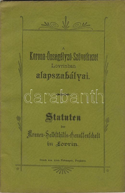 1902 A Korona Önsegélyező Egylet Lovrinban alapszabályai magyar és ném... https://www.darabanth.com/hu/29-Gyorsarveres/29.0/Festmeny-mutargy-papirregiseg-egyeb/Nyomtatvanyok-Printed-papers~256/1902-A-Korona-Onsegelyezo-Egylet-Lovrinban-alapszabalyai-magyar-es-nemet-nyelven-Alois-Pirkma~II53237