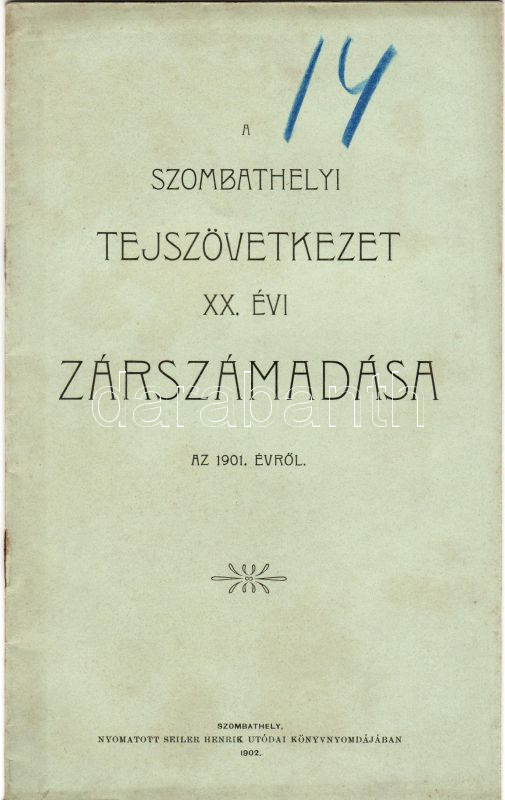 1902 A szobathelyi tejszövetkezet zárszámadása; Seiler Henrik utódai k... https://www.darabanth.com/hu/29-Gyorsarveres/29.0/Festmeny-mutargy-papirregiseg-egyeb/Nyomtatvanyok-Printed-papers~256/1902-A-szobathelyi-tejszovetkezet-zarszamadasa-Seiler-Henrik-utodai-konyvnyomdaja~II37104