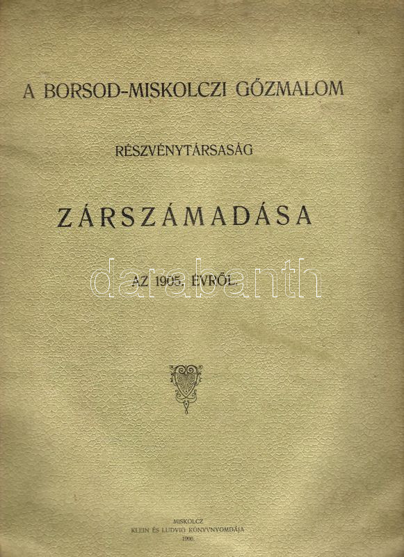 1906 A Borsod-Miskolczi Gőzmalom Rt.zárszámadása; Klein és Ludvig köny... https://www.darabanth.com/hu/29-Gyorsarveres/29.0/Festmeny-mutargy-papirregiseg-egyeb/Nyomtatvanyok-Printed-papers~256/1906-A-Borsod-Miskolczi-Gozmalom-Rtzarszamadasa-Klein-es-Ludvig-konyvnyomdaja~II37119
