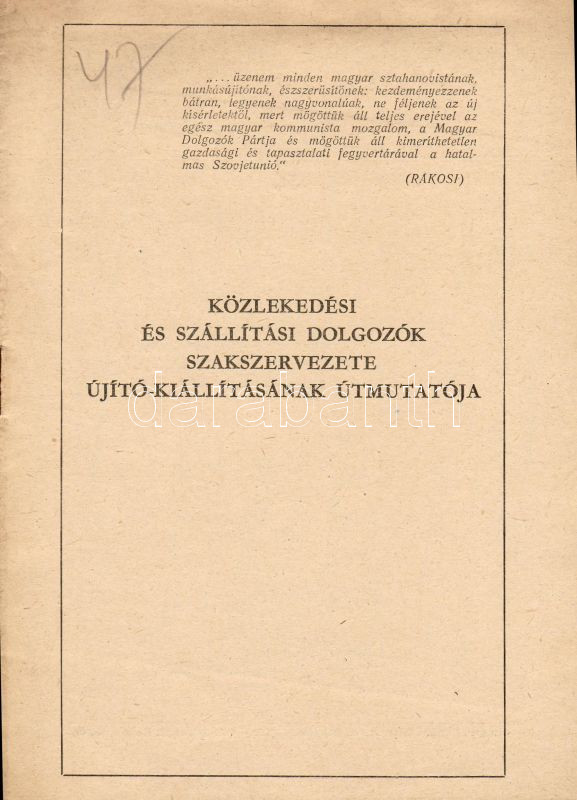 Közlekedési és szállítási dolgozók szakszervezete újító kiállításának ... https://www.darabanth.com/hu/29-Gyorsarveres/29.0/Festmeny-mutargy-papirregiseg-egyeb/Nyomtatvanyok-Printed-papers~256/Kozlekedesi-es-szallitasi-dolgozok-szakszervezete-ujito-kiallitasanak-utmutatoja~II37305
