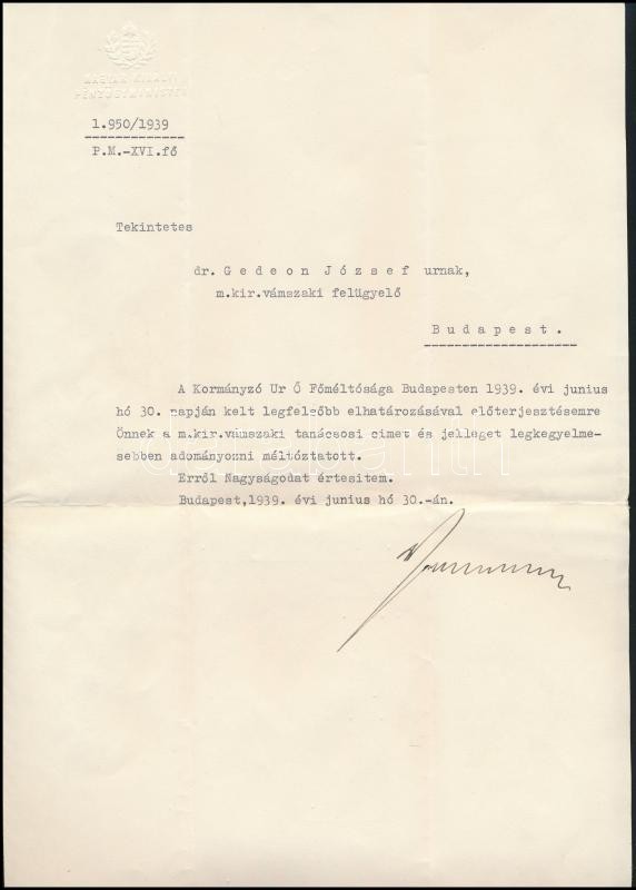 Leírás: 1939 Reményi Schneller Lajos pénzügyminiszter aláírása kinevezésen