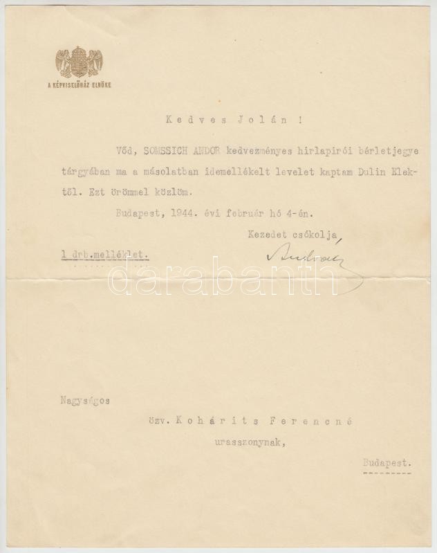 Leírás: 1944 Tasnádi Nagy András a képviselőház elnökének aláírása hivatalos levélen