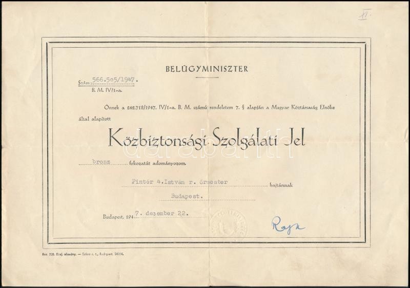Leírás: 1947 Rajk László belügyminiszter aláírása kitüntetés adományozó levélen