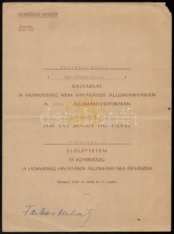 Leírás: 1949 Farkas Mihály (1904-1965) honvédelmi miniszter aláírása egy előléptetésen,