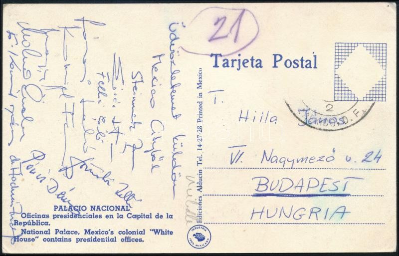 1968 A bronzérmes magyar vízilabda válogatott aláírásai egy a Mexikói Olimpiáról küldött képeslapon (Steinmetz János, Pócsik Dénes, Szívós István, Konrád Ferenc, Konárd János, Felkai László, Molnár Endre, Sárosi László, Dömötör Zoltán, dr. Bodnár András, Mayer Mihály)