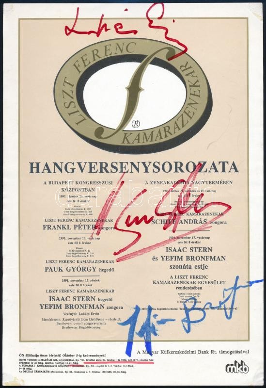 Leírás: 1991 Isaac Stern (1920-2001) hegedűművész aláírása műsorlapon / Autograph signatures.
