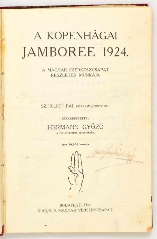 Hermann Győző(szerk.): A koppenhágai Jamboree 1924. A magyar cserkészcsapat részletes munkája. Bp., 1924, Magyar Versenycsapat. Későbbi félvászon kötéssel, ráragasztott borítólappal, kopottas állapotban.
