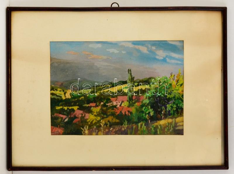 Leírás: Duray Tibor (1912-1988): Kilátás a falura. Akvarell, papír. Jelzett. Üvegezett keretben. 20x30 cm