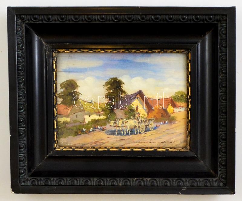 Leírás: Németh György (1888-1962): Lovasszekér a faluban. Olaj, repedezett falemez, jelzett, üvegezett keretben, 12,5×17,5 cm