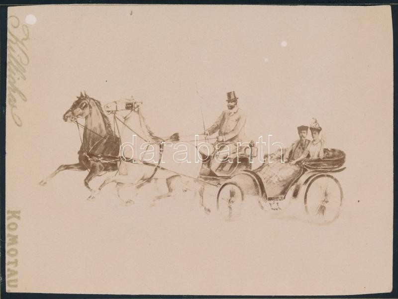 cca 1885 Habsburg Rudolf (1858-1889) koronaherceg és felesége, Stefánia (1864-1945) belga hercegnő hintóban, korabeli sokszorosított fotómontázs, 11×16 cm / Rudolf, Crown Prince of Austria and his wife, vintage photo