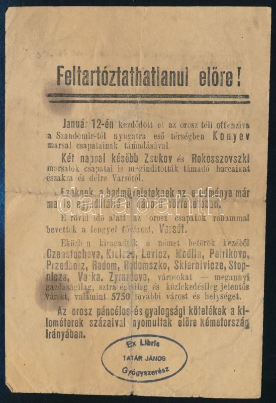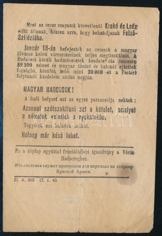 1945 A Vörös Hadsereg magyar katonák számára ledobott röplapja. https://www.darabanth.com/hu/29-Nagyaukcio/29.1/Festmeny-mutargy-papirregiseg-egyeb/Militaria~11792/1945-A-Voros-Hadsereg-magyar-katonak-szamara-ledobott-roplapja~II1773515