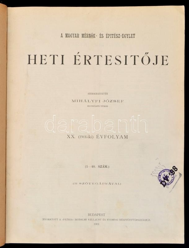 1901 A Magyar Mérnöki és Építészegylet heti értesítőjének teljes évfol... https://www.darabanth.com/hu/29-Nagyaukcio/29.1/Festmeny-mutargy-papirregiseg-egyeb/Nyomtatvanyok~11787/1901-A-Magyar-Mernoki-es-Epiteszegylet-heti-ertesitojenek-teljes-evfolyama-bekotve~II1766715