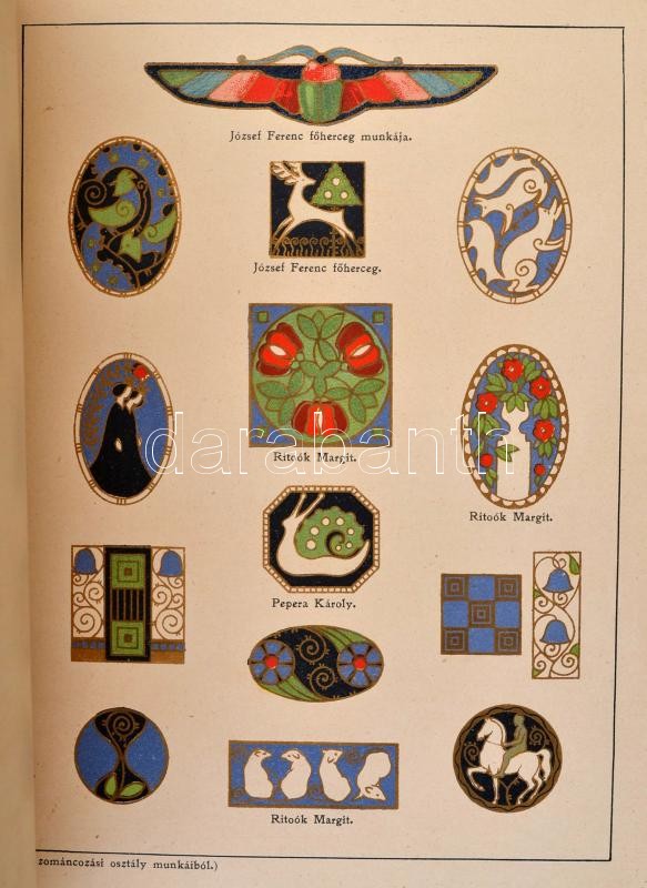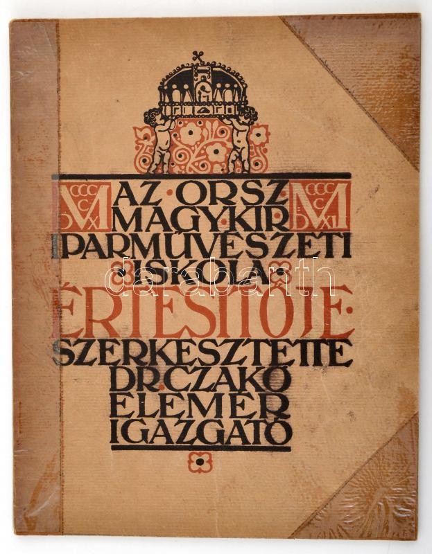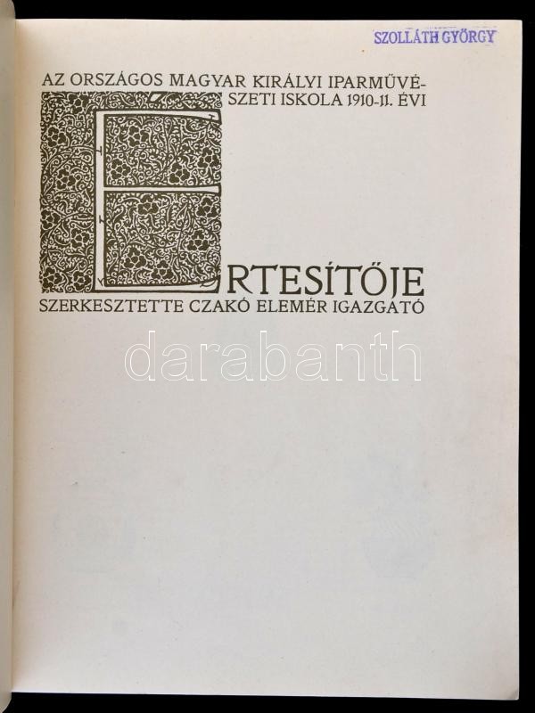 1911 Az Országos Magyar Királyi Iparművészeti Iskola 1910-1911. évi értesítője. Szerk.: Czakó Elemér. Bp., Pátria, 24 p.+8+11 t. Gazdag képanyaggal illusztrálva. Kiadói papírkötés, javított borítóval és kötéssel.
