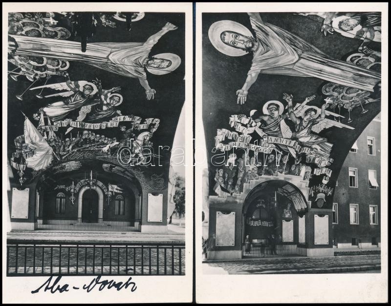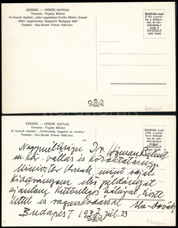1937 Aba-Novák Vilmos (1894-1941) festőművész által Hóman Bálint (1885-1951) vallás- és közoktatásügyi miniszternek ajándékozott 2 db képeslap a szegedi Hősök kapujáról, rajta a festő saját kezű aláírása és sorai