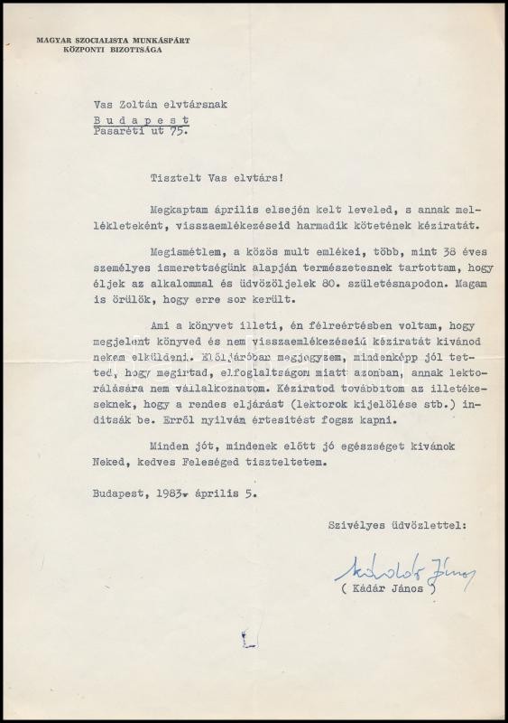 1983 Kádár János (1912-1989) személyes saját kézzel aláírt levele Vas Zoltán (1903-1983) író, 56-os államminiszter részére.