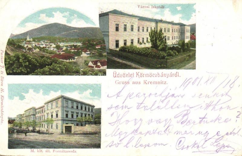 Leírás: 1901 Körmöcbánya, Kremnitz, Kremnica; Városi iskolák, M. kir. állami főreáltanoda. Paxner J. és Biron H. kiadása / schools (EK)