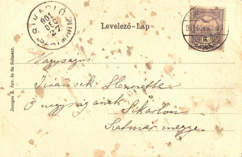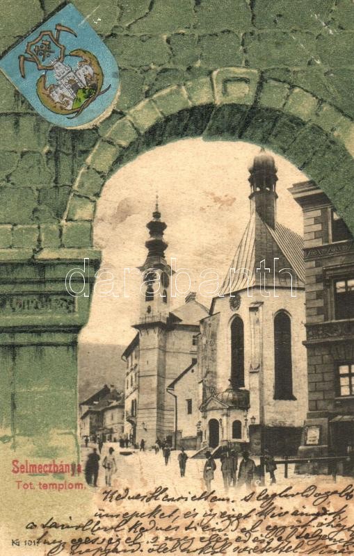 1901 Selmecbánya, Schemnitz, Banska Stiavnica; Tót templom. Címeres litho keret. Joerges A. özv. és fia / Kirche / church. Coat of arms litho frame (fl)