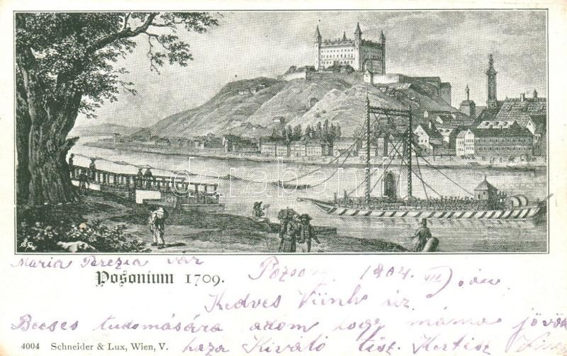 Leírás: 1904 Pozsony, Pressbrug, Bratislava; Posonium anno 1709. (EK)