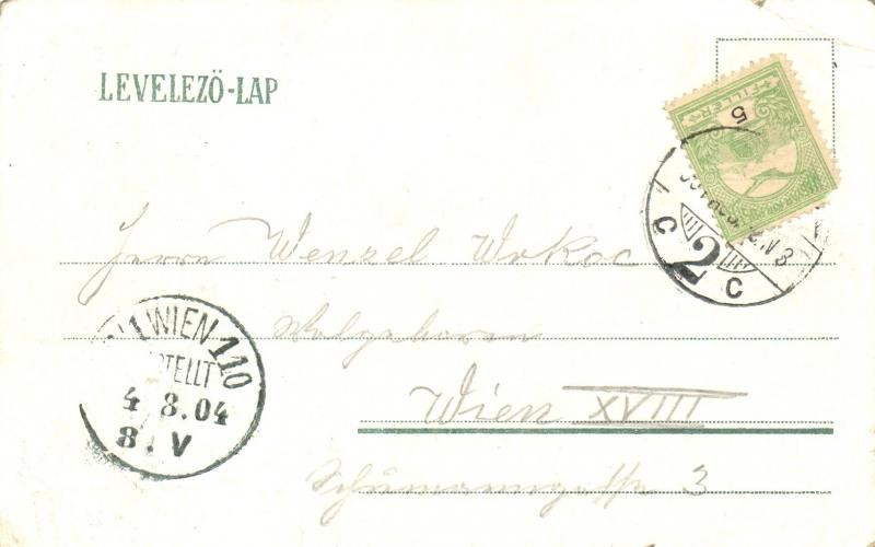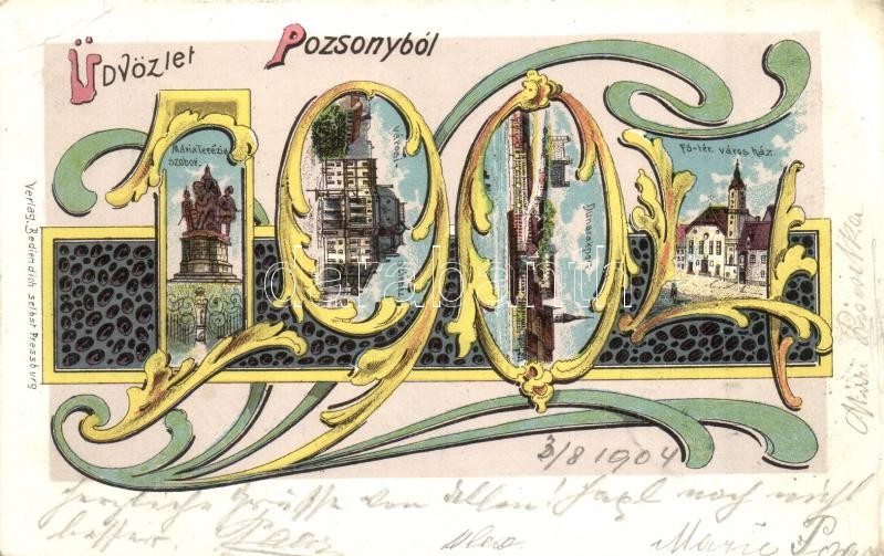 1904 Pozsony, Pressburg, Bratislava; Szecessziós Üdvözlőlap. Mária Terézia szobor, Fő tér, városháza, színház, Duna rakpart / statue, quay, town hall, main square, theatre. Art Nouveau litho Greeting card (EK)