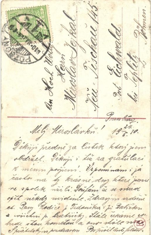 1910 Pozsony, Pressburg, Bratislava; Ligeti Kávéház, Vaskutacska, IX. Malom II. tó. Magyar nemzeti zászló díszítés / cafe, Eisenbrünnel (Eisenbründl), mill and lake. Hungarian national flag (EK)