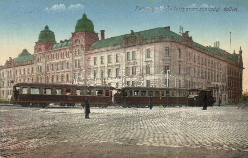 Leírás: 1916 Pozsony, Pressburg, Bratislava; Hadtestparancsnoksági épület, városi motor vasút / Army Headquarters, urban railway, train