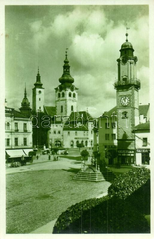 1937 Besztercebánya, Banská Bystrica; Masaryk tér, templomok, toronyóra, gyógyszertár, Takarékpénztár, Dohánybolt, Skoda üzlete / square with shops, churches, clock tower, pharmacy, savings bank