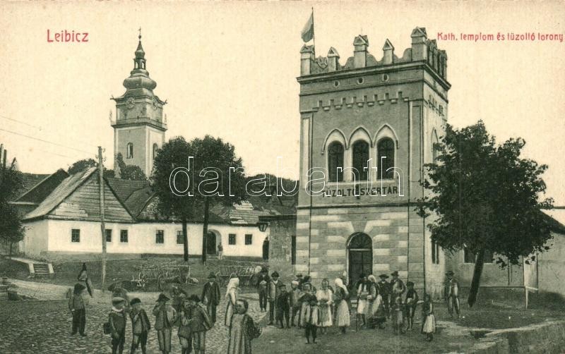 Leírás: Leibic, Lubica; Katolikus templom és tűzoltó torony. W.L. Bp. 2881. Kiadja Götz Amália / church and fire tower (fl)
