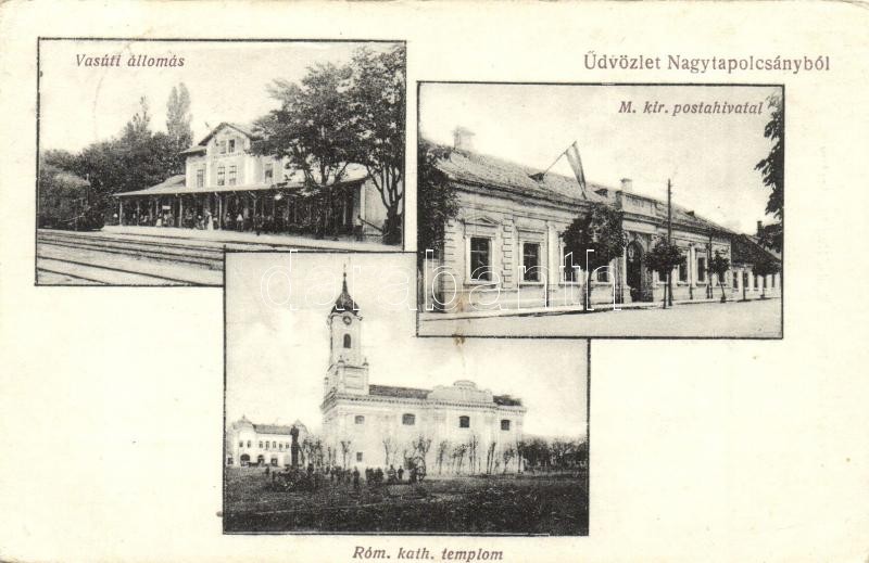 Nagytapolcsány, Topolcany; vasútállomás, Római katolikus templom, M. kir. postahivatal / Bahnhof, Kirche, Post / railway station, church, post office (EK)
