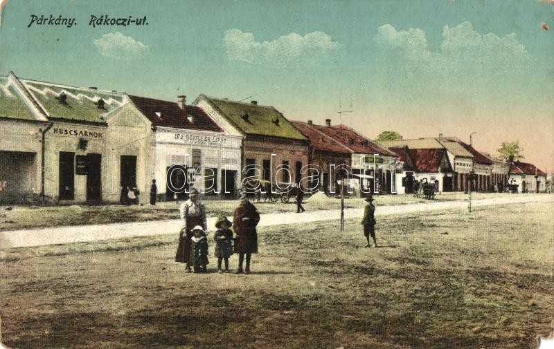 Párkány, Stúrovó, Gockern; Rákóczi út, húscsarnok, Ifj. Schiller Lipót üzlete / street view with meat hall and shops (lyukas és sarokhiány / pinhole and missing corner)