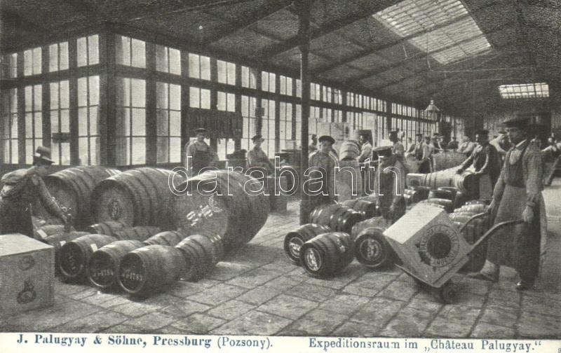 Pozsony, Pressburg, Bratislava; J. Palugyay és fia pezsgőgyár, belső munkásokkal / Expeditionsraum im Chateau / champagne factory interior with workers (fl)