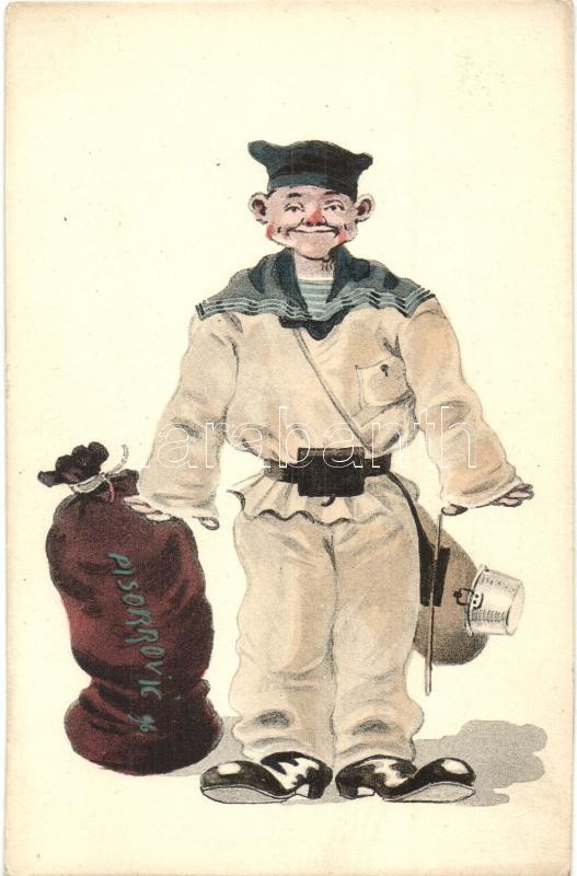 Leírás: K.u.K. Kriegsmarine mariner, humour. G. Costalunga 16200. Pola 1909. unsigned Ed. Dworak