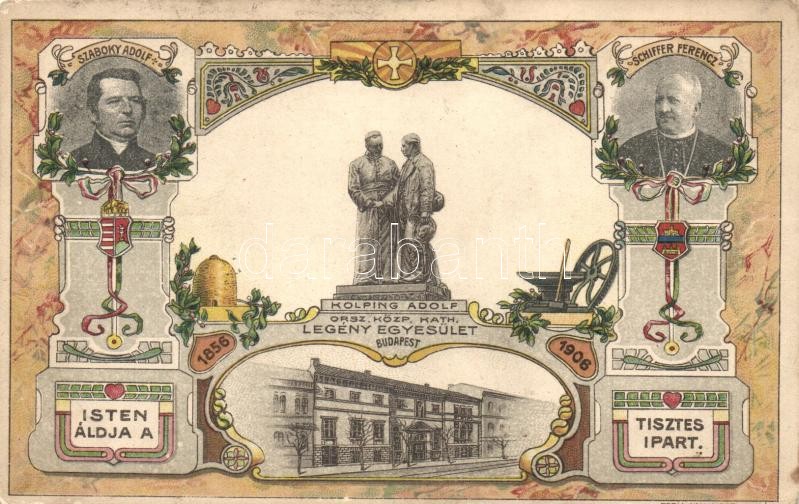 1856-1906 Budapest, Országos Központi Katolikus Legény Egyesület 50. évfordulójára készített emléklap. Szaboky Adolf, Kolping Adolf és Schiffer Ferenc, Art Nouveau litho. Tervezte Killinger Hugó (fl)