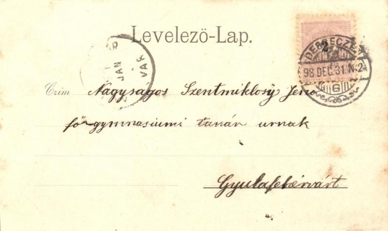 1898 Debrecen, Állami főreáliskola, Törvényszéki palota, Izraelita imaház, zsinagóga, Iparbank palota, Placc nyugati részlete, tér. László Albert kiadása. Art Nouveau, floral