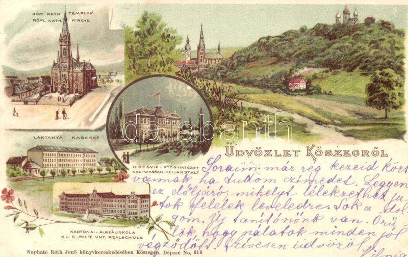 Leírás: 1898 Kőszeg, Hideg vízgyógyintézet, Római katolikus templom, laktanya, Katonai alreáliskola, Róth Jenő floral litho (Rb)