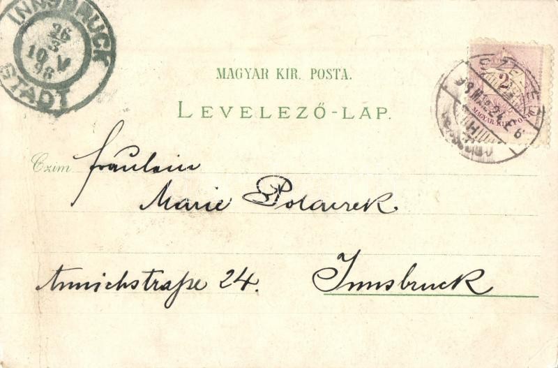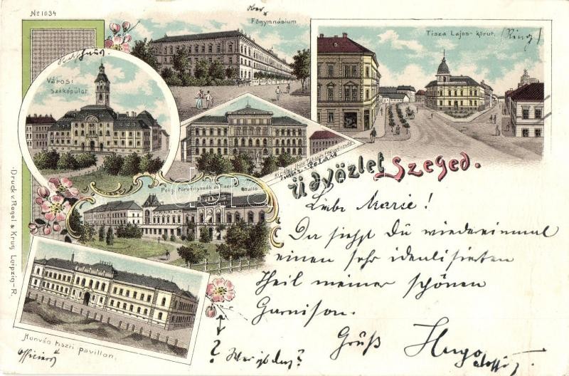 1898 Szeged, Tisza Lajos körút, Főgimnázium, Városi széképület, Honvéd tiszti pavilon, Polgári törvényszék, Tisza szálló. Regel & Krug No. 1034. Art Nouveau, floral, litho (fa)