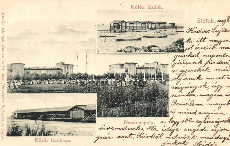 Leírás: 1901 Siófok, Külön fürdők, közös fürdőház, népünnepély. Kiadja Ellinger Ede fényképész