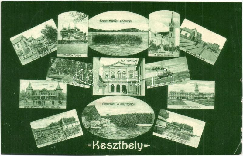 Leírás: 1909 Keszthely, Mozaikos montázslap a zsinagógával, szállodákkal és vasútállomással. Mérei Ignácz kiadása (EK)