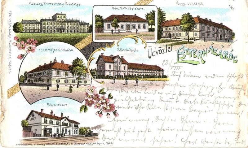 1917 Eszterháza (Fertőd), Herceg Eszterházy kastély, Nagy vendéglő, Római katolikus népiskola, Liszt Ferenc hajdani lakása, Nádszövőgyár, vasútállomás. Kitüntetve a nagy ezüst éremmel a Nizzai kiállításon 1899. Kummert L. Art Nouveau, floral, litho (kis szakadások / small tears)