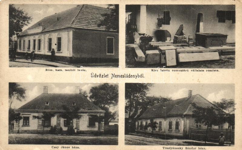 Leírás: 1928 Nemesládony, Római katolikus tanítói lakás, Kiss István cementáru vállalat részlete, Csay János és Trsztyánszky Sándor háza. Hangya kiadása (EK)