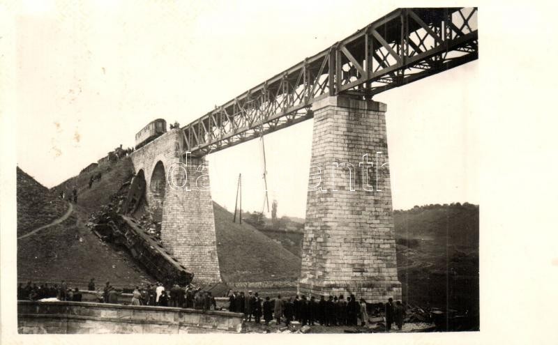 1931 Biatorbágy, Torbágy; Felrobbantott vasúti híd Matuska Szilveszter merénylete után, mozdony maradványok / Blown up viaduct with the ruins of the train. photo
