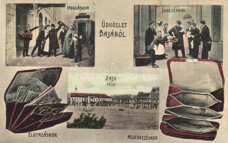 Leírás: Baja. Induláskor, érkezéskor, elutazáskor és megérkezéskor. Humoros montázslap. Wurmfeld Gyula kiadása / Humorous montage postcard