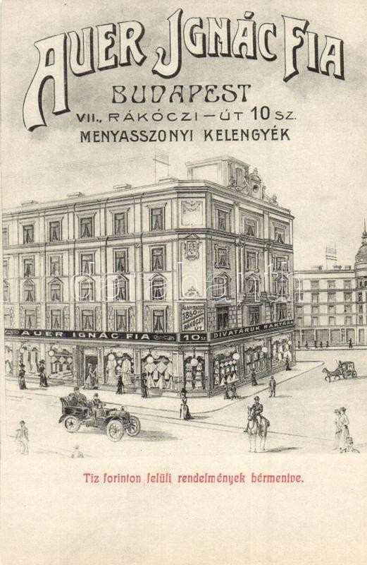 Budapest VII. Auer Ignác fia menyasszonyi kelengye üzlete. Rákóczi út ... https://www.darabanth.com/hu/29-Nagyaukcio/29.1/Kepeslapok/Magyarorszag~11796/Budapest-VII-Auer-Ignac-fia-menyasszonyi-kelengye-uzlete-Rakoczi-ut-10-reklamlap-Hungaria~II1768317