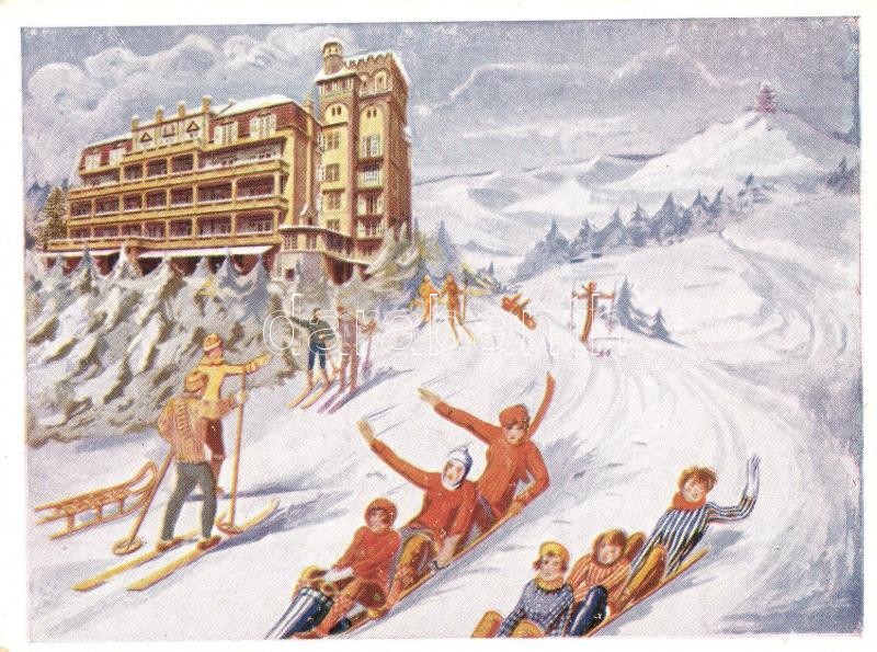 Leírás: Budapest XII. Svábhegyi szanatórium reklámlapja szánkózókkal / Hungarian sanatorium advertisement, winter sport, sleighing
