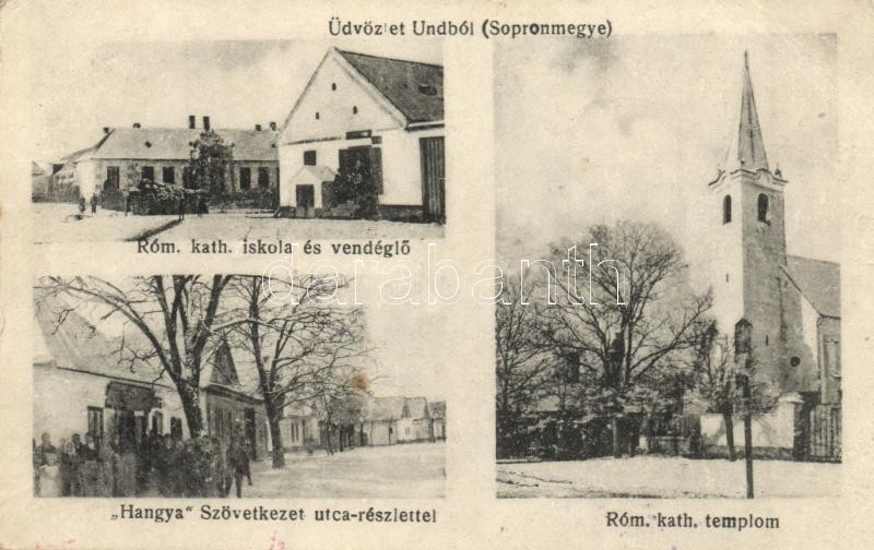 Leírás: Und, Undten (Sopron); Római katolikus templom és iskola, vendéglő, Hangya szövetkezet, utca