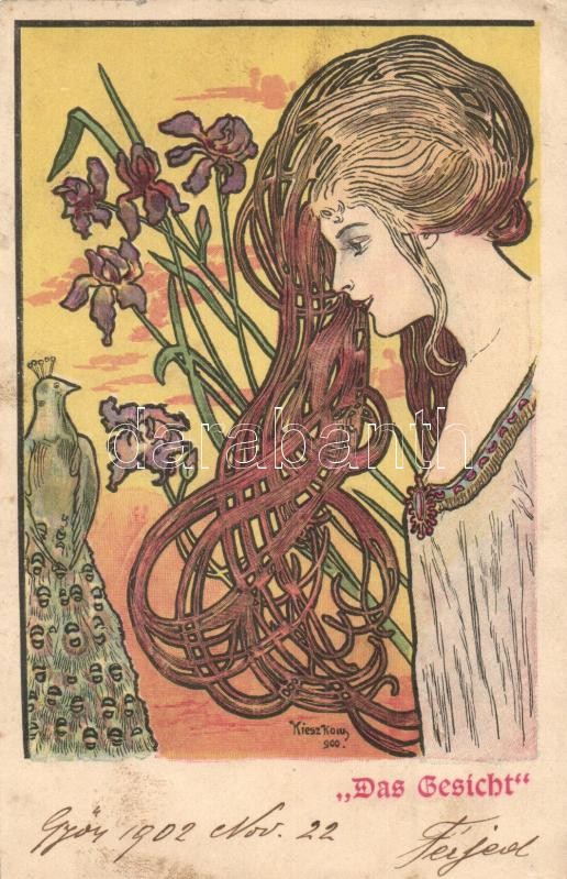 1902 Das Gesicht / Art Nouveau lady with peacock s: Kieszkow (EK) https://www.darabanth.com/hu/29-Nagyaukcio/29.1/Kepeslapok/Muveszlapok~11871/1902-Das-Gesicht-Art-Nouveau-lady-with-peacock-s-Kieszkow-EK~II1767802