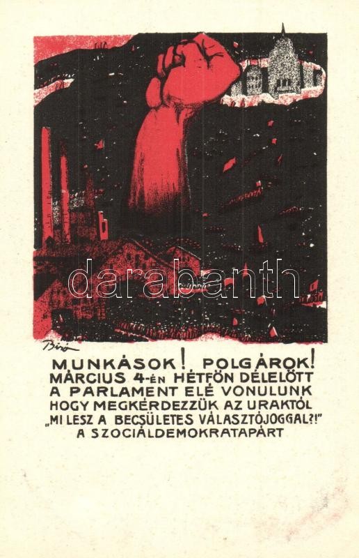 Munkások! Polgárok! A Szociáldemokrata Párt felhívása a Parlament elé vonulásra. Népszava Könyvkereskedés kiadása / Hungarian Socialist Democratic Party propaganda card s: Bíró